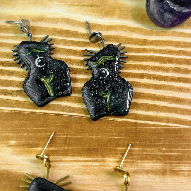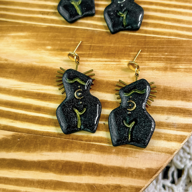 Celebra la feminidad y la energía del cuerpo con nuestros pendientes Cuerpo Sagrado. Cada pieza está cuidadosamente elaborada a mano, resaltando los detalles dorados que hacen único a cada pendiente y el acabado brillante que parece capturar la luz como una obra de arte.