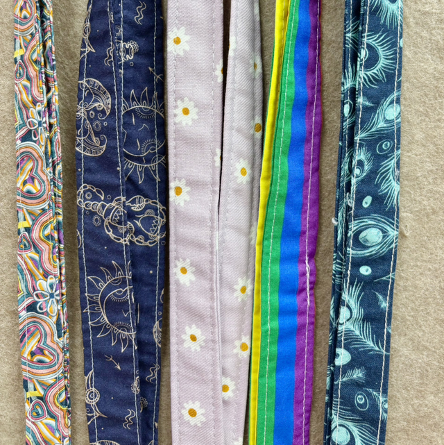 Cada colgador está hecho a mano con telas de patrones de fantasía y colores vibrantes —desde motivos cósmicos y florales hasta arcoíris o plumas—, pensados para reflejar tu personalidad y energía positiva.