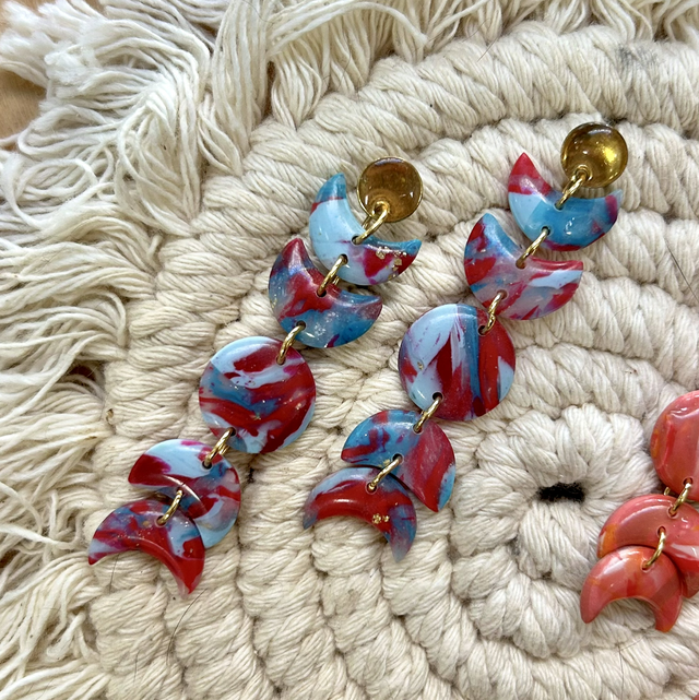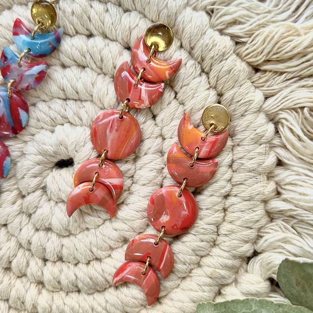 Pendientes Fases de Luna son los más vendidos de la tienda todo el año. Cada par es una pieza exclusiva: SON COMBINACIONES ÚNICAS E IRREPETIBLES, creadas a mano una a una. No repetimos patrones fijos ni colores exactos, porque el efecto mármol que utilizamos no se puede replicar igual dos veces.