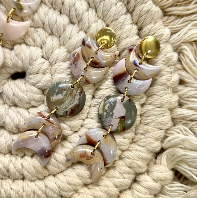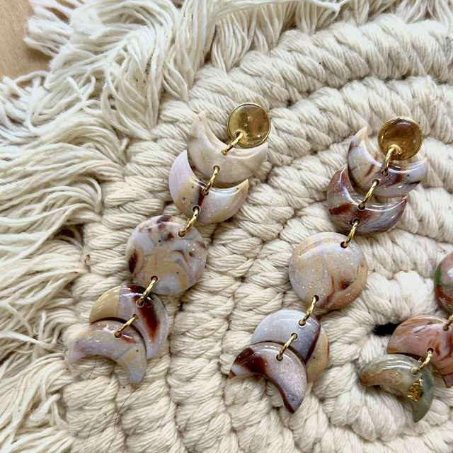 Pendientes Fases de Luna son los más vendidos de la tienda todo el año. Cada par es una pieza exclusiva: SON COMBINACIONES ÚNICAS E IRREPETIBLES, creadas a mano una a una. No repetimos patrones fijos ni colores exactos, porque el efecto mármol que utilizamos no se puede replicar igual dos veces.