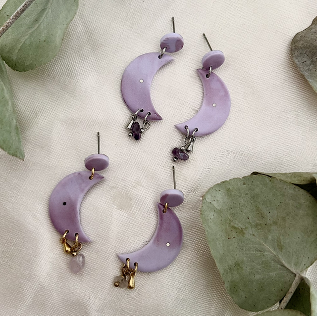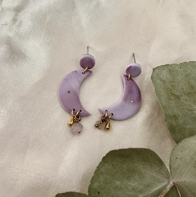 Los pendientes Luantica Malva son una pieza artesanal única, elaborada a mano en arcilla polimérica con un elegante degradado en tonos malva. Incorporan detalles en acero inoxidable y piedra amatista natural, que aportan luz y equilibrio al diseño.