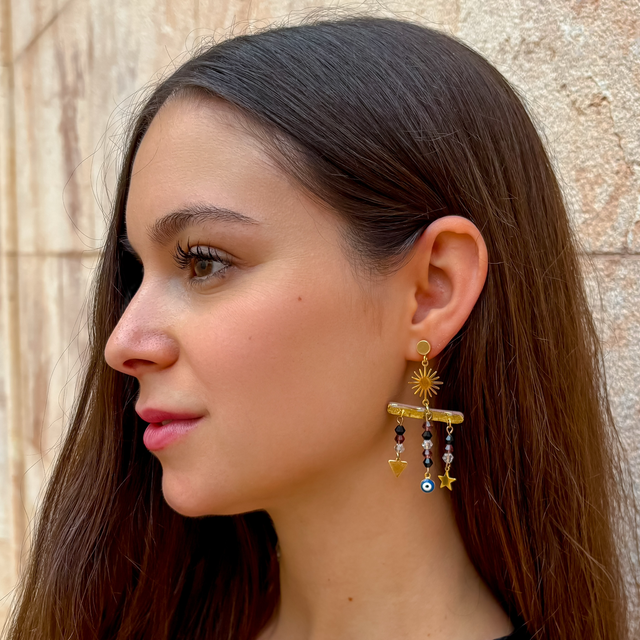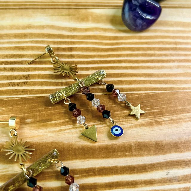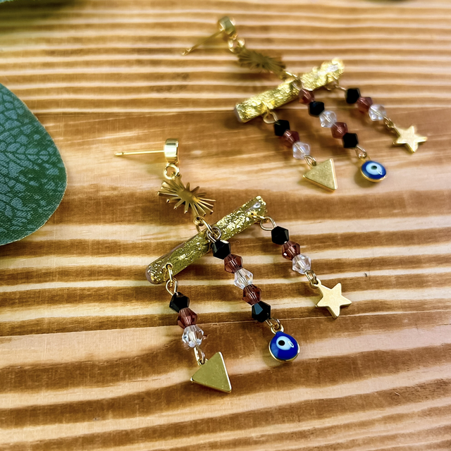 Descubre la armonía y la energía en movimiento con nuestros pendientes péndulo. La pieza central está elaborada a mano en arcilla polimérica dorada, de la que cuelgan tres hileras de cristales en tonos negro, burdeos y blanco, cada una con un diseño simbólico: un triángulo, un círculo y un ojo turco en el centro, aportando protección y estilo.
